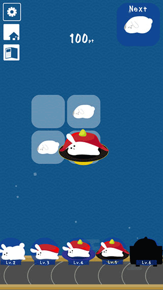 1、该游戏的操作方法非常简单。只需合并即可获得全新的兔子寿司。