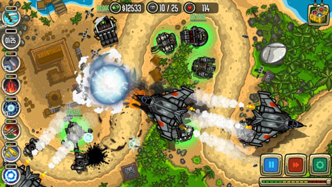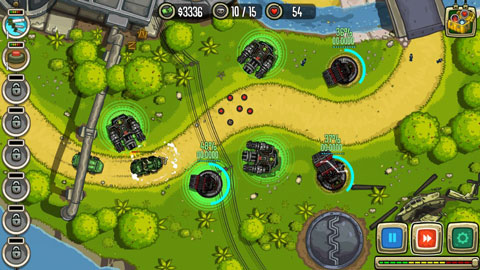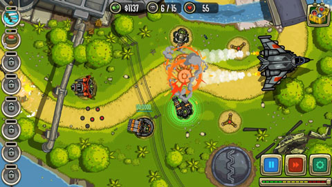 总体来说,游戏还是遵循经典的塔防游戏规则,还是一日既往的以防御敌军的入侵为目标,但与之不同的则是这里采用更加贴合的现代战争技术精心打造,虽说玩法上并没有什么突出,但在特效的制作上可谓非常的良心,就拿防御的工程来说,机枪扫射非常逼真,而且还是自动瞄准的,火力全开的导弹炸裂效果都可谓非常的震撼,而玩家只需要通过建造、升级相应的设施即可,但值得说明的是升级需要一定的缓冲时间,在这个时间段不能进行攻击,也是你最值得注意的地方,往往这都是敌人逃脱的空隙。