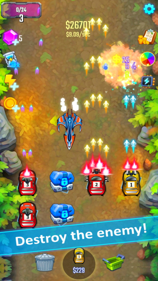 射击飞车是一款全新的射击策略游戏。游戏画面和背景都非常精致清新。有很多种飞车供玩家选择。每辆飞车都有不同的性能。它能否抵御外星人的攻击?玩家可以通过改装升级他们的飞机,也可以通过合并最新的飞行汽车来战斗。你需要开着你的飞行车来这里进行飞行拍摄冒险。在这个关卡里,你不仅要射杀那些敌人,还要确保自己在敌人的攻击中的安全。对球员来说还是很难的。