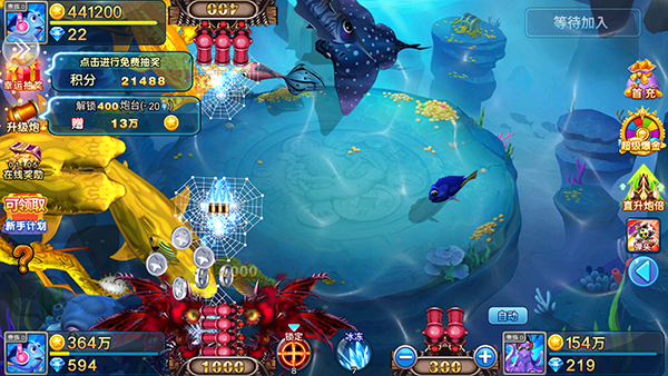 4、渔网与炮台:提供多种渔网和炮台供玩家选择,每种渔网和炮台都有其独特的属性和效果,满足玩家不同的捕鱼需求。