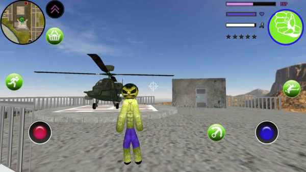 玩家在绿巨人火柴人绳索英雄游戏可以使用虚拟按钮控制角色轻松释放强大技能;