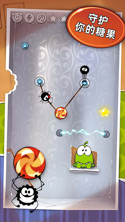5、飞行糖果,飞行糖果是随另一个糖果飞行的(飞行糖果有一个类似蜜蜂的装饰)。当普通糖果被任何一只Om Nom吃掉时,飞行糖果立刻变回普通糖果。