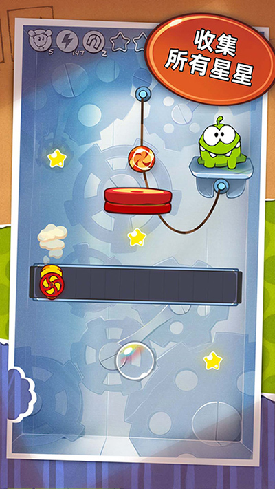 6、变换按钮,这个按钮是由糖果来开启的,两只Om Nom只有一只是在正面,另一只在背面,糖果触碰按钮后可旋转石柱平台并喂送糖果(仅于第五章出现)。