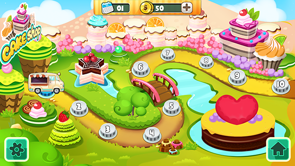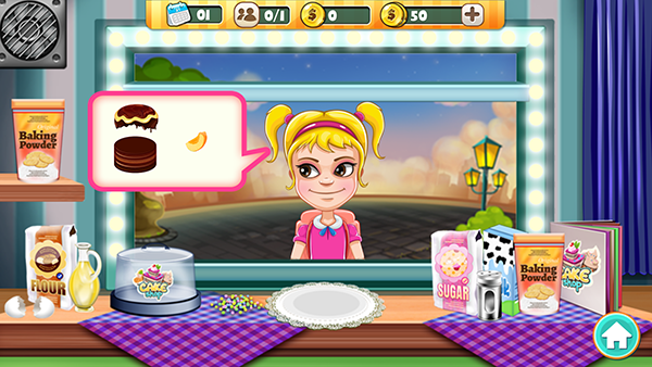 2、横版卡通风设计的边游戏边学习的烘焙技术的模拟娱乐小游戏。