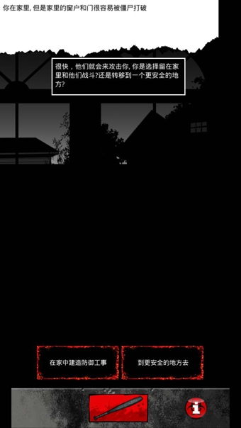 不得不说,这游戏主要属于手绘风格,文字冒险嘛~就是不断的问问题,通过你所给出的答案来影响结局。游戏背景简单明了,僵尸来临,你需要尽最大可能生存下去。四个初始地点家、警察局、检查站与楼房会带来不同的开始方式,每一次选择都会带来不同的后续影响,可能是能够在游戏中继续前进、可能是惨遭僵尸杀戮、也可能是被官方人员擒获,所以必须结合游戏中的剧情环境、谨小慎微地做出决定——类似担心惊扰僵尸悄悄进入某个房间却被其他幸存者射杀这种事实在是难以预料。