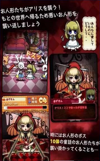 《爱丽丝与恐怖童话家族》是一款采用黑暗哥特风的日系另类童话题材风格手游,它阐述了另一面的童话本质,童话不再是治愈温暖的了,而是带着恐怖与荒诞的色彩。玩家需要控制爱丽丝去杀死游戏中的人偶推动剧情的发展。