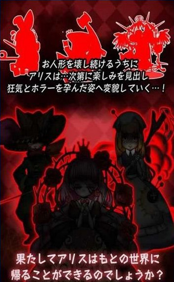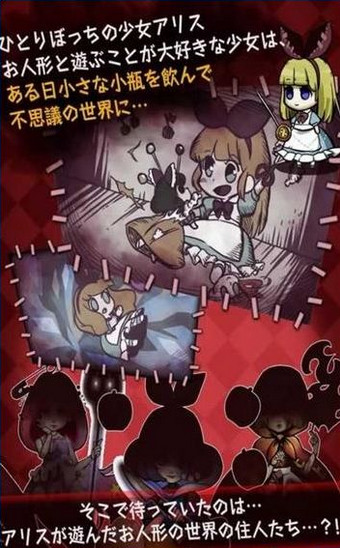 《爱丽丝与恐怖童话家族》(アリスとこわ~い童話ファミリー)是一款背脊发凉的禁断的黑暗童话故事特征的迷你的动作冒险游戏。采用以童话“不思议国的爱丽丝”作为题材的不思议系哥特式故事,登场可爱病娇的角色。角色中也搭载语音,由片桐ゆりか担当。游戏中还采用超级耐玩钥匙图鉴机能和话题的多结局。可以免费玩到最后的一款可爱病娇黑暗童话游戏。