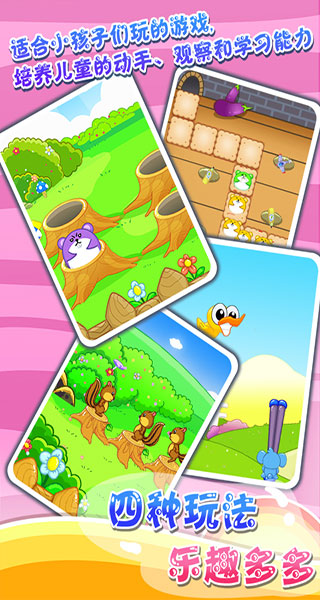 益智游戏:专为宝宝开发的益智类小游戏,培养孩子的反应能力及手的协调能力,主要有打地鼠、打鸭子、智力训练、左右脑开发、儿童拼图、七巧板、儿童钓鱼、儿童冒险跑酷、宝宝打电话、宝宝找茬、动物农场喂养动物、植物乐园、玩具店记忆训练、抓娃娃玩具等。