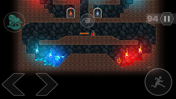 控制与液体同色的角色推动石块,在液体中铺路,让另一个冰火人通过。
