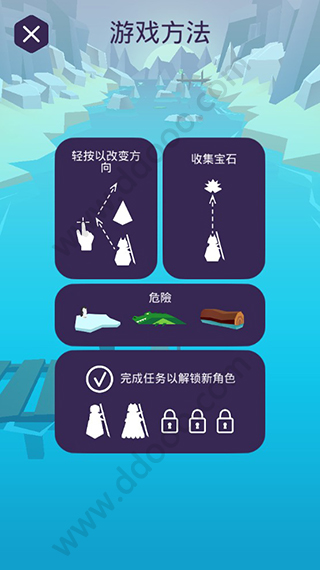 - 游戏中玩法很简单,玩家要操控一只小动物驾驶着小船在一条满是障碍物的小河上漂流,必须不断避开障碍、去到更远才能收集到更多宝石!
