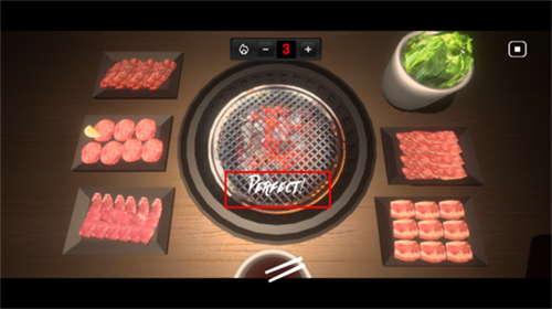 1、烤肉模拟器的玩法很简单,和我们日常烤肉的操作几乎一样,十分还原,游戏屏幕上方的“-、+”标志是可以调整火候大小,如下图红框所示,想要烤出美味的烤肉,火候一定要掌握好;