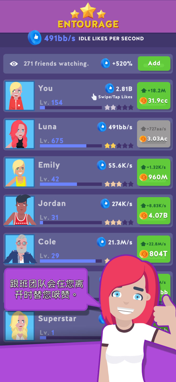 赚钱的路子还不止这些哦。您可以组建一支跟班团队,在您不在的时候替您收钱,等您回来就可以哗啦啦入账啦!您还可以升级自己的衣柜,打造几百款崭新造型,与您的好友相互比拼,抢占全球“名人管”直播排行榜的冠军位。比比谁被人点的赞最多?