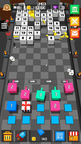 在适当位置放置合成方块的炮塔,对不断侵入的方块进行射击,消灭方块的数量越多,就能得到更丰厚的奖励。