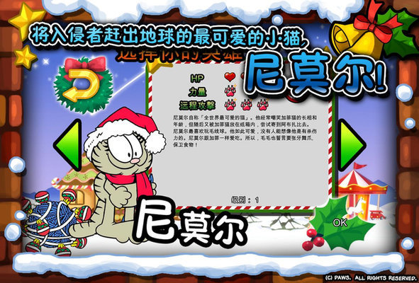 1.进入游戏之后玩家们要选择关卡,选择战友,选择技能,选择宝物。逐一选择好之后点击开始游戏。点击屏幕左右控制加菲猫前进和后退。