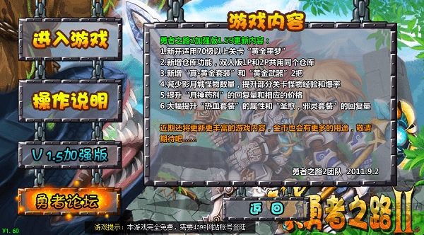 全新的勇者之路2加强版登场啦!突破性的挑战难度系统,让不同水平的玩家都能找到最爽快的体验!全新的华丽技能以实现技能连击为核心制作,开发想象去打造属于自己的华丽技能连携吧!全新的职业切换系统,不同的武器种类可以使用不同的职业技能!只需一键,战士和法师的变换就这么简单!觉得过关游戏太单调?超过十种的关卡大BOSS,每个都具有多样的攻击方式,等待你来挑战!