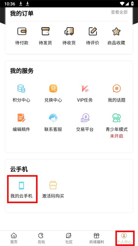 2、在【个人中心】页面点击【我的云手机】按钮,进入云手机;