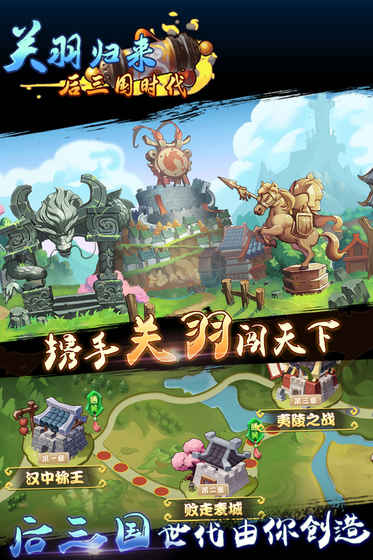 关羽归来后三国时代是一款三国题材的角色扮演手游,携手关羽争霸三国,救下了关羽,一款较为另类的回合制三国卡牌手游,展开一场别开生面的冒险旅程,玩家再有游戏中作为主公,九伐中原?这些精彩的后三国故事等你来战!