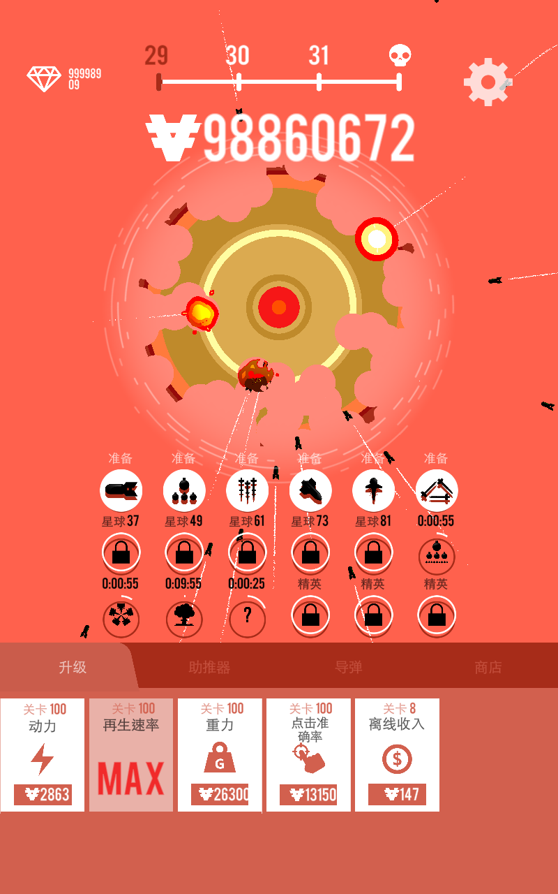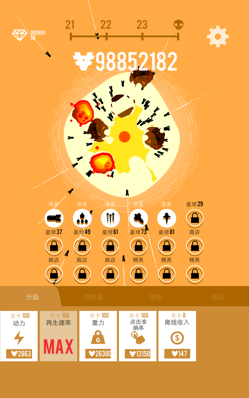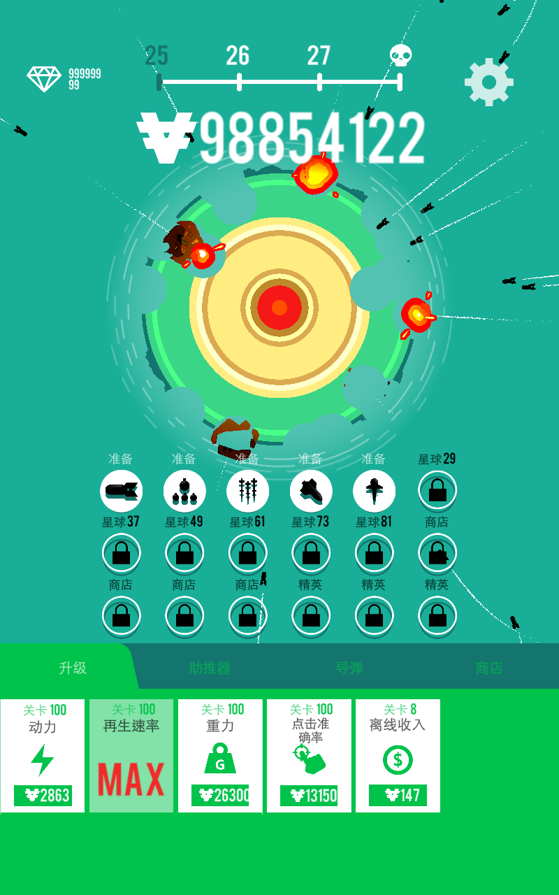 3、将行星摧毁后,你可以升级你的飞船和导弹向着其他星系进行攻击,还可以解锁全新的关卡!
