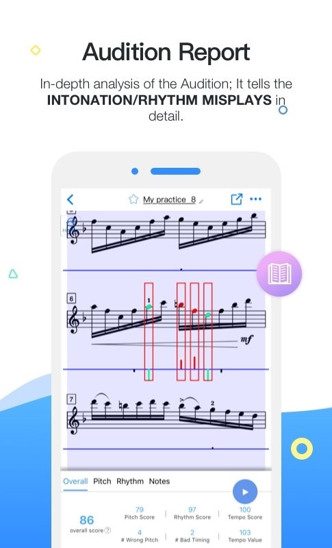 多声部:应用程序跟随乐谱上的多个乐器,并指示每个音符的偏移。还支持钢琴伴奏的伴奏曲目。